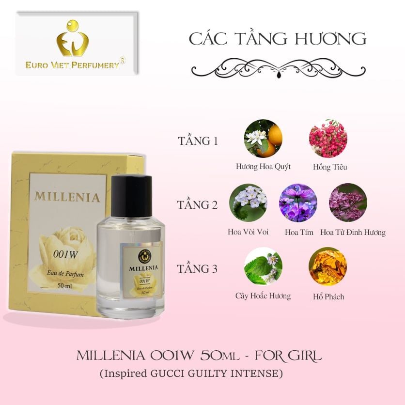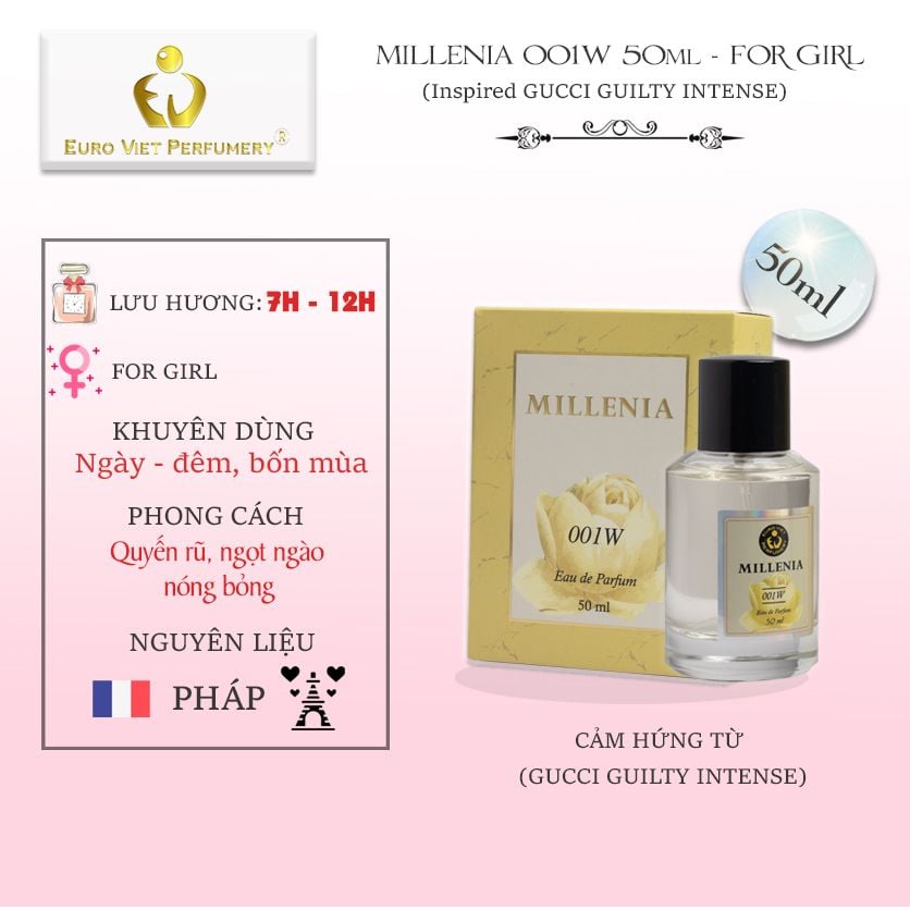 MIÊU TẢ: Nước hoa MILLENIA 001W (Gucci Guilty Intense) được sáng tạo với hương thơm gợi cảm và khiêu khích hơn, mang trong mình hương thơm nồng nhiệt và ấm áp.