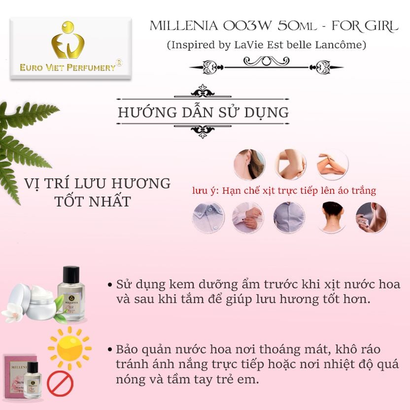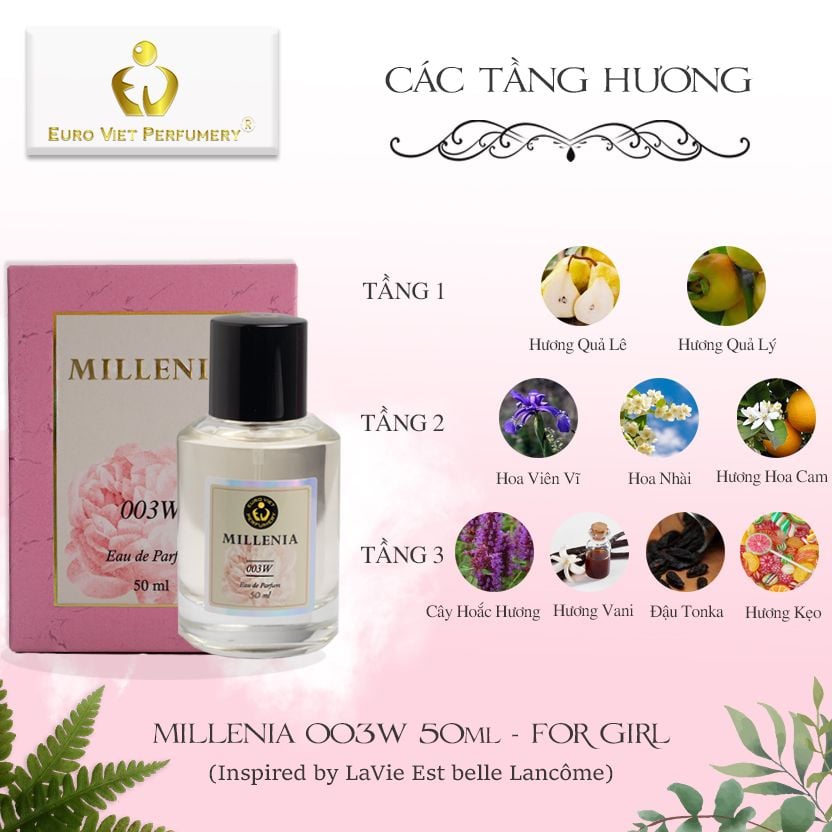 - Miêu tả: MILLENIA 003W có độ lưu hương lâu khá ấn tượng, không quá sốc mùi tạo cảm giác khó chịu như những loại nước hoa mùi lạ khác, mang cảm giác tươi trẻ, nữ tính và năng động của những cô gái yêu đời.