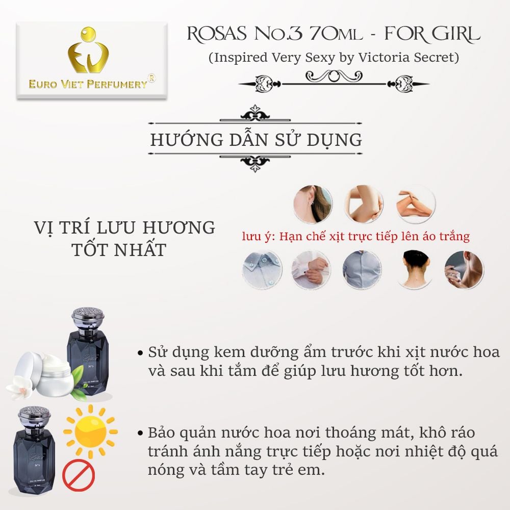 - MIÊU TẢ: Nếu như Parfum de Rosas No.1 đại diện cho sự quyến rũ nhẹ nhàng, Parfum de Rosas No.2 cho sự sang trọng thì đến Parfum de Rosas No.3 bạn sẽ hoàn toàn hài lòng với sự gợi cảm mãnh liệt, sự khiêu khích đầy kích thích. Parfum de Rosas No.3 thích hợp cho các cô nằng cá tính, trẻ trung và tự tin vào sự gợi cảm của bản thân. Có thể nói đây là mùi hương đa năng khi sử dụng phù hợp cho cả ngày lẫn đêm và dùng được cho tất cả các mùa trong năm