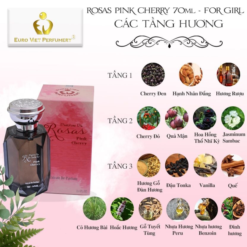ROSAS PINK Cherry sẽ đem tới cho chúng ta một trải nghiệm thú vị, về những gì mà ngành công nghiệp thơm có thể làm với quả Anh đào (Cherry). Để rõ hơn, hãy tận hưởng mùi hương mới của nhà EURO VIET , để xem một trái Cherry nhỏ bé có thể làm được những gì với khứu giác của chúng ta.