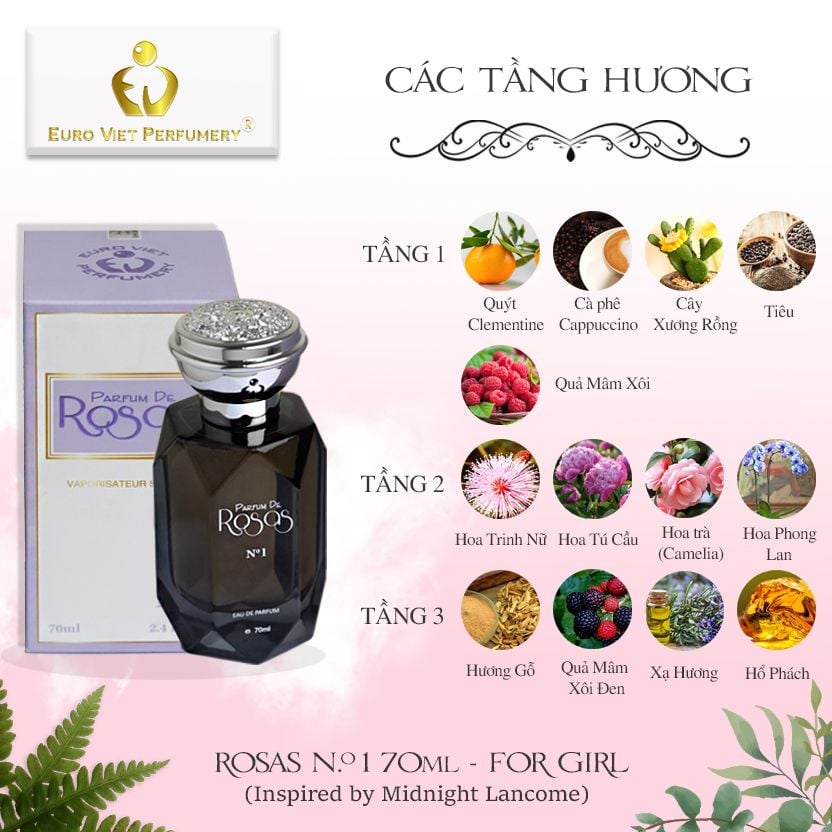 Parfum de Rosas N.1 là mùi hương nhẹ nhàng nhưng đầy quyến rũ phù hợp với các quý cô muốn thể hiện sự cuốn hút và ngọt ngào trong những buổi gặp mặt ngoài trời hay chuyến picnic lãng mạn. Hương thơm mô phỏng sự quyến rũ như một bông hoa e ấp nở vào trời đêm Thu - Đông khi tiết trời mát lạnh mang lại mùi hương nồng nàn, ấm áp, gợi lên sự tò mò khám phá từ người đối diện. Parfum de Rosas N.1 có nốt hương đàu hơi gắt của hoa hồng và mâm xôi thanh mát. Tuy nhiên, sau đó chốc lát, bạn sẽ cảm nhận ngay được mùi hương nhẹ nhàng của hoa mẫu đơn hòa quyện sự cay nồng của hồ tiêu. Nốt hương cuối thư giãn bởi hương vani thoảng cùng tuyết tùng, hổ phách.