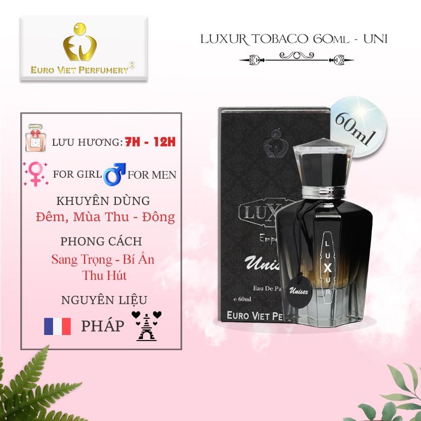 Luxur Unisex “Sang trọng – Ấm áp – Mang tính biểu tượng” là những từ ngữ mà EVP dành tặng cho chai nước hoa này. Dòng nước hoa mở ra thế giới đầy ắp mùi hương thủ công mỹ nghệ khó cưỡng và dễ gây nghiện. Nước hoa Luxur Unisex được sáng chế một cách tuyệt vời dựa trên nhóm hương gia vị phương đông. Cho bạn sở hữu một mùi hương sang trọng, bí ẩn và thu hút những người xung quanh.