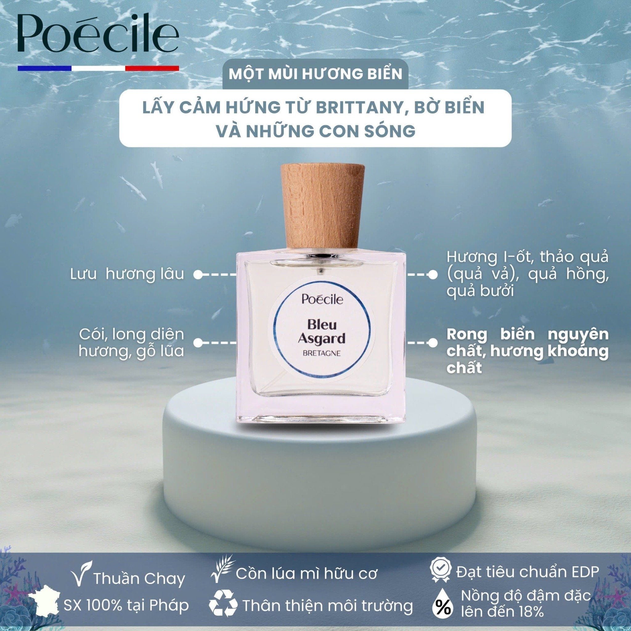 Băng qua bờ biển xanh mướt của xứ sở Brittany, Blue Asgard sẽ đưa bạn đắm mình vào làn nước xanh thẳm của đại dương để bạn được ru ngủ bởi những con sóng Đại Tây Dương tràn đầy mê hoặc, ngắm nhìn bọt nước tung sóng đọng lại trên những tảng đá Breton. Bạn sẽ được mơn man làn da dịu dàng và tận hưởng sự tươi mát, mới mẻ của hương vị biển không ngừng đổi mới.