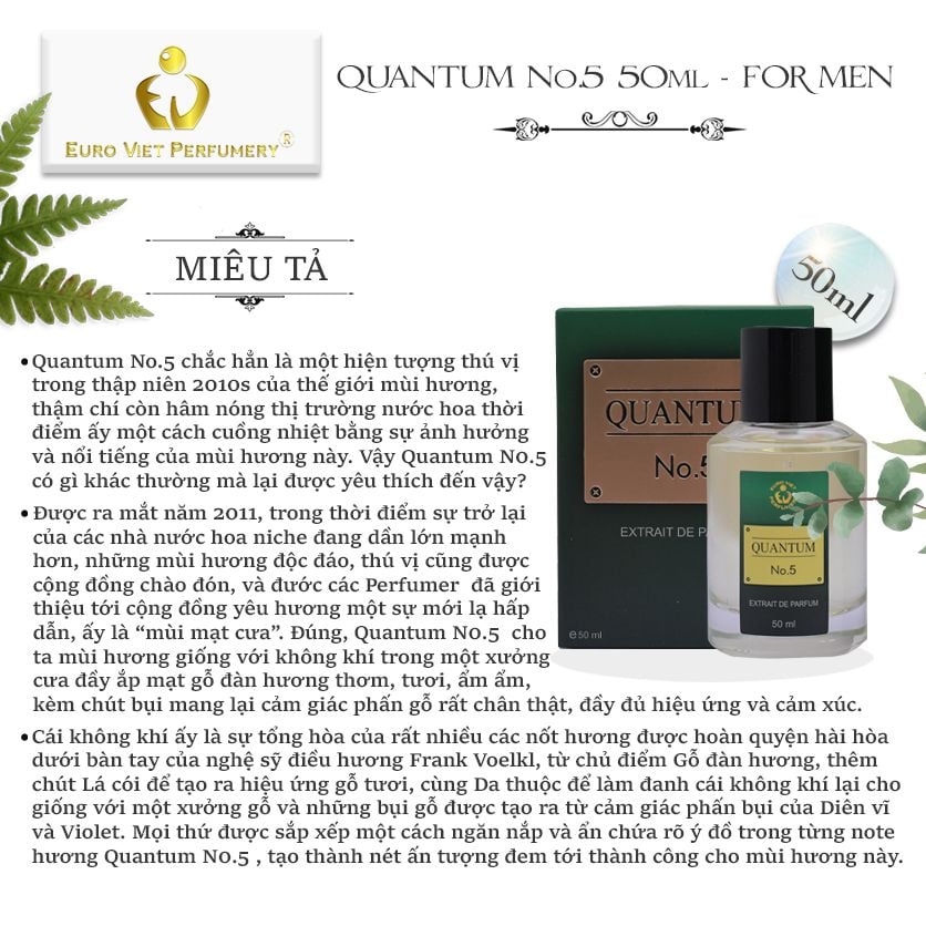 Cái không khí ấy là sự tổng hòa của rất nhiều các nốt hương được hoàn quyện hài hòa dưới bàn tay của nghệ sỹ điều hương Frank Voelkl, từ chủ điểm Gỗ đàn hương, thêm chút Lá cói để tạo ra hiệu ứng gỗ tươi, cùng Da thuộc để làm đanh cái không khí lại cho giống với một xưởng gỗ và những bụi gỗ được tạo ra từ cảm giác phấn bụi của Diên vĩ và Violet. Mọi thứ được sắp xếp một cách ngăn nắp và ẩn chứa rõ ý đồ trong từng note hương Quantum N0.5 , tạo thành nét ấn tượng đem tới thành công cho mùi hương này.