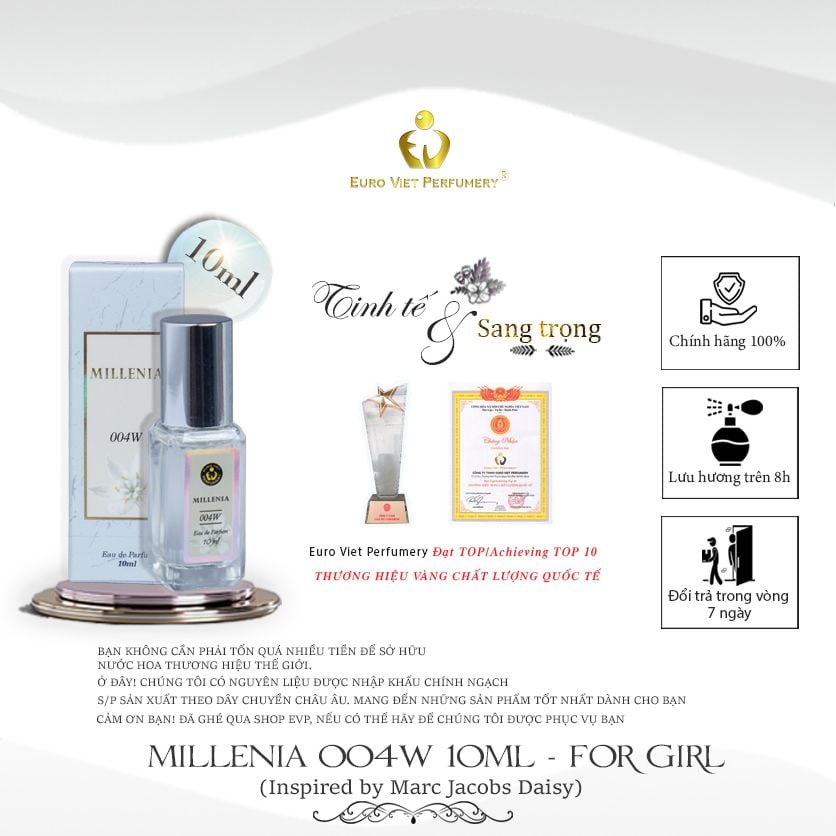 Nước hoa MILLENIA 004W mang một mùi hương tươi mát điểm chút ngây thơ tinh nghịch như hình ảnh bông hoa cúc trắng nhỏ xinh. Vẻ đẹp của hoa cúc thật khó tả, không rực rỡ kiêu sa cũng không hương thơm quí phái. Nhưng hoa cúc vẫn đẹp một cách giản đơn, tinh khôi và có khả năng xoa dịu tâm hồn con người.