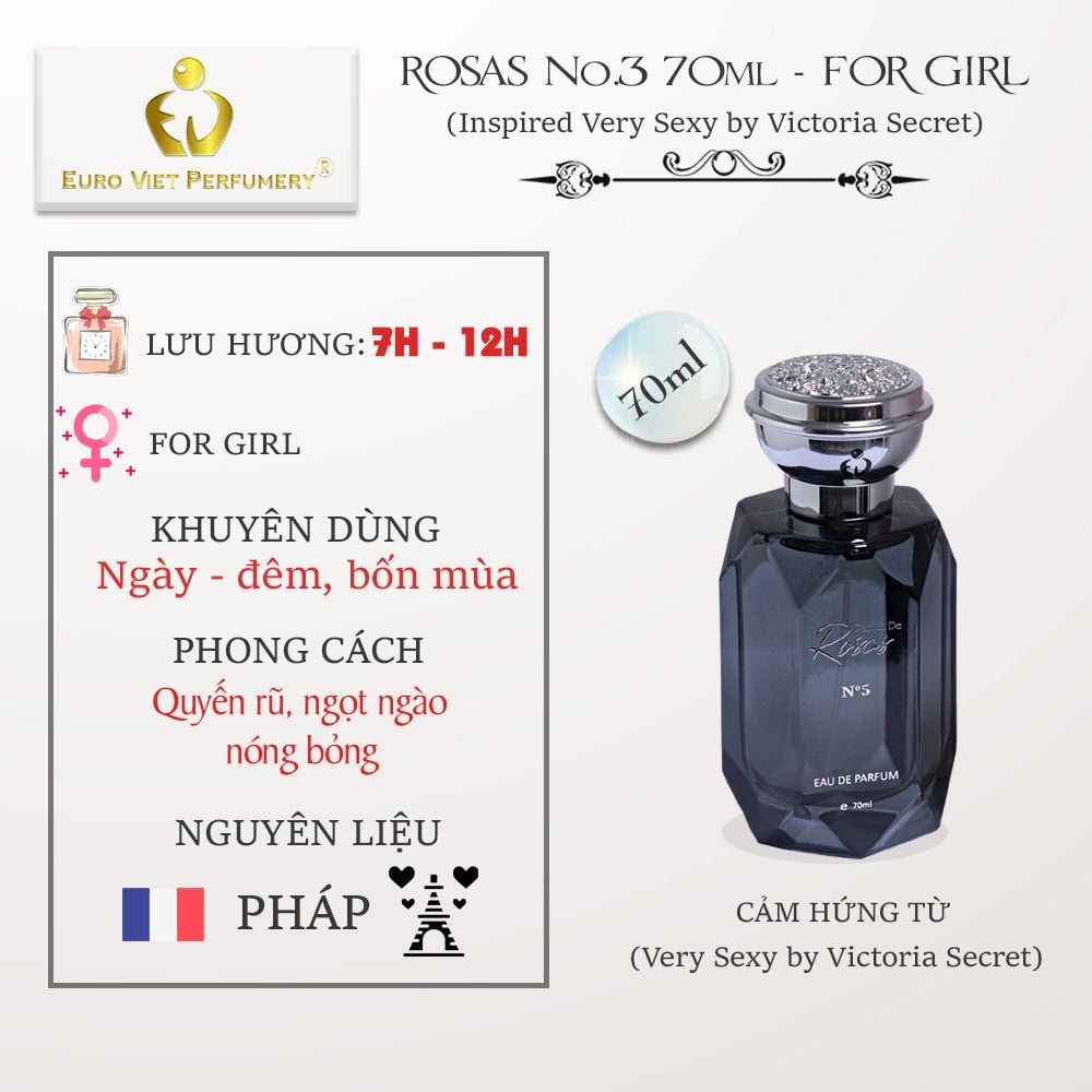 - MIÊU TẢ: Nếu như Parfum de Rosas No.1 đại diện cho sự quyến rũ nhẹ nhàng, Parfum de Rosas No.2 cho sự sang trọng thì đến Parfum de Rosas No.3 bạn sẽ hoàn toàn hài lòng với sự gợi cảm mãnh liệt, sự khiêu khích đầy kích thích. Parfum de Rosas No.3 thích hợp cho các cô nằng cá tính, trẻ trung và tự tin vào sự gợi cảm của bản thân. Có thể nói đây là mùi hương đa năng khi sử dụng phù hợp cho cả ngày lẫn đêm và dùng được cho tất cả các mùa trong năm