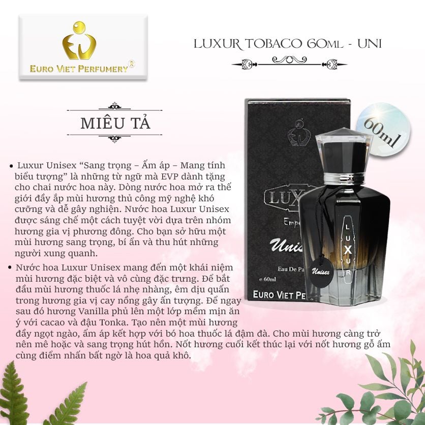 Luxur Unisex “Sang trọng – Ấm áp – Mang tính biểu tượng” là những từ ngữ mà EVP dành tặng cho chai nước hoa này. Dòng nước hoa mở ra thế giới đầy ắp mùi hương thủ công mỹ nghệ khó cưỡng và dễ gây nghiện. Nước hoa Luxur Unisex được sáng chế một cách tuyệt vời dựa trên nhóm hương gia vị phương đông. Cho bạn sở hữu một mùi hương sang trọng, bí ẩn và thu hút những người xung quanh.